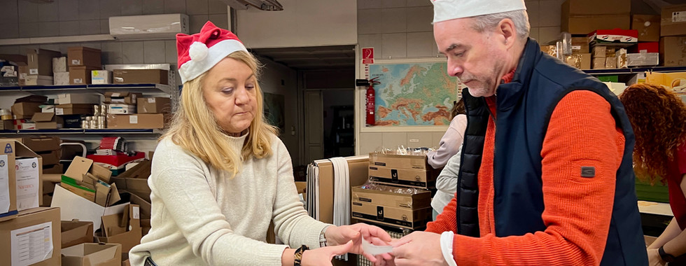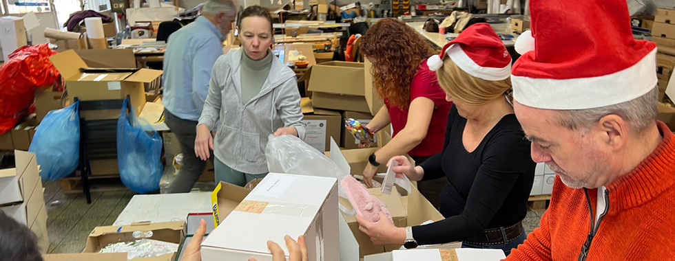 The gifts were carefully wrapped and labeled at Ágnes Bobrovoczki's print shop, to make the distribution smooth and personal. And what fun we had with the little team of volunteers, to pack them all. A surprise gust turned up: ther Ukrainian Ambassador for Ukraine, Mr Sándor Fegyír. Victor Ágpston,, our friend from the Hungarian Reformed Church picked them up, and transported across a border. hours before we got to the venue.